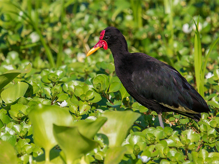 Habitat: Jacanas are typically found in freshwater wetlands, marshes, ponds, and shallow lakes in tropical and subtropical regions of the world. They are often associated with dense vegetation, where they can forage for invertebrates and small aquatic creatures.